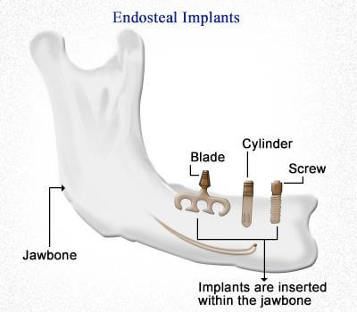 Az endosteal fog implantátumokat használják leggyakrabban a fogbeültetéshez. Több típusuk létezik, melyek általában a rögzítés módjában térnek el egymástól. Ilyenek például a csavar, henger vagy penge formájú fog implantátumok. A módszer alkalmazásának előfeltétele, hogy a páciens elegendő mennyiségű csontszövettel rendelkezzen, amely képes szilárdan megtartani az implantátumot és a ráépített fogpótlást.